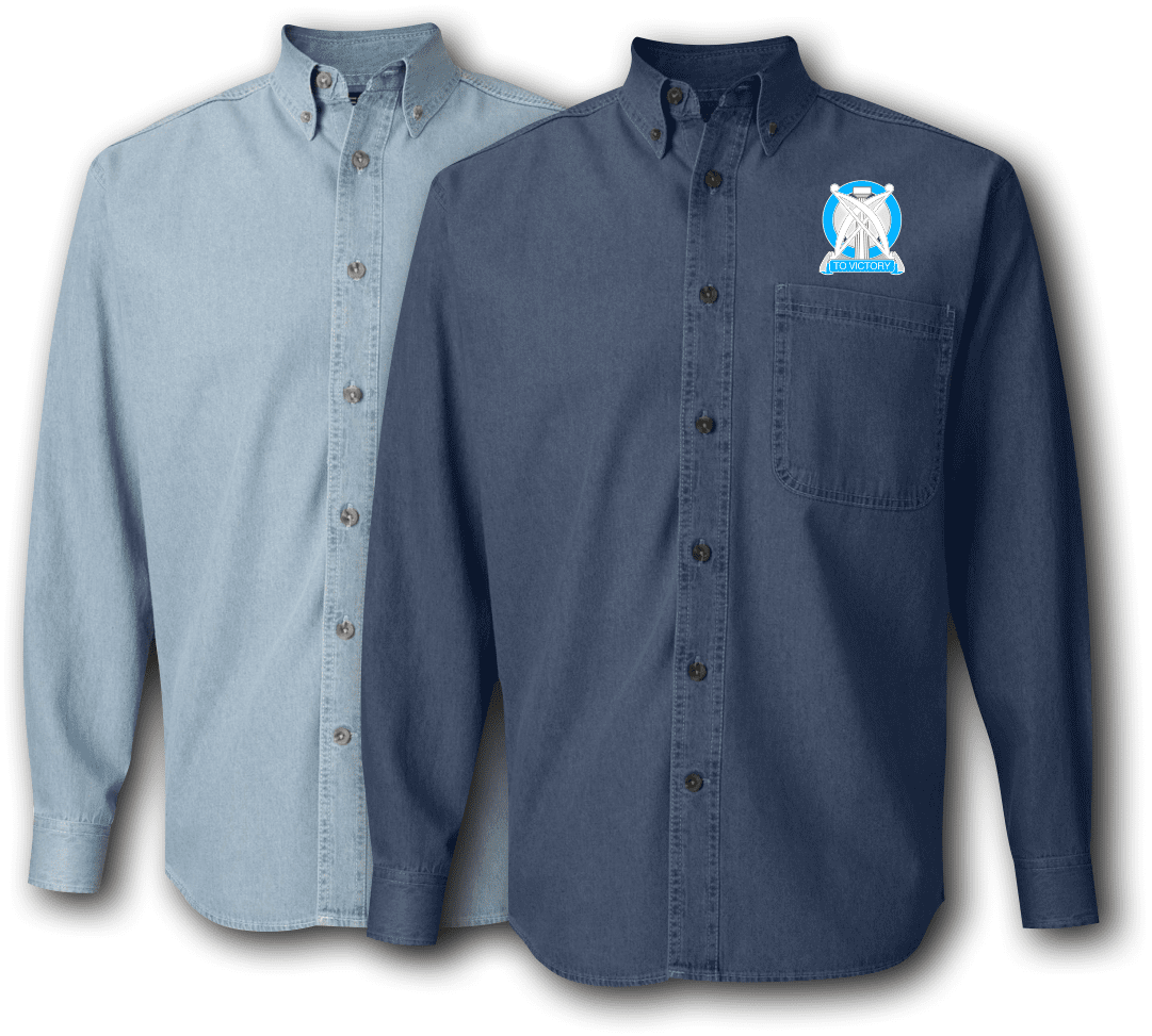 This 102nd Arcom Division Unit Crest Denim Shirt is made 6.5 oz. 100% cotton denim, Button-down collar with woodtone buttons, Three woodtone buttons on adjustable placket cuff, Double-needle sittching throughout, felled seams, Left chest pocket, Two-ply back yoke and locker loop, and a seamless body with set-in sleeves. Each denim shirt is embroidered in the USA with high quality Rapos thread and is available in 2 colors. Custom text can be added beneath the insignia from the drop down menu above. This 102nd Arcom Division Unit Crest Denim Shirt would make a wonderful addition to your collection or a great gift! It’s quality is guaranteed.