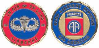 This 82nd Airborne Division Challenge Coin is polished bronze with a diamond wave cut edge. Measuring 1 5/8" diameter each challenge coin has the look and feel of quality. Our Challenge Coins are proudly produced, under strict standards, by the nation's leading manufacturer of military products. Each challenge coin would make a great addition to your collection or a wonderful gift.