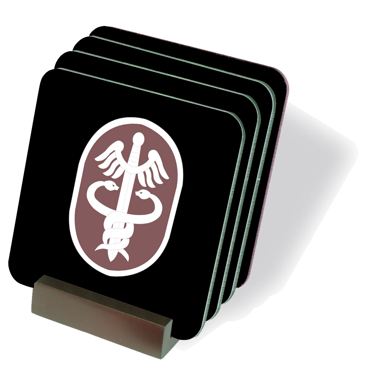 ArmyDecals is proud to offer this US Army Medical Command drink coaster set. Each drink coasters measure 3 ¾”, has a gloss finish surface with soft cork underside, and includes the wood coaster display rack pictured above.