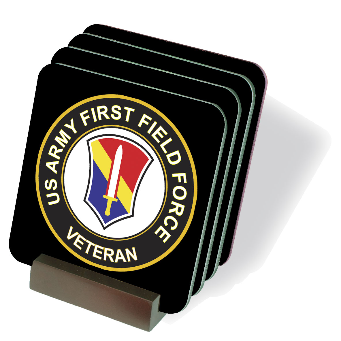 ArmyDecals is proud to offer this US Army First Field Force Veteran drink coaster set. Each drink coasters measure 3 ¾”, has a gloss finish surface with soft cork underside, and includes the wood coaster display rack pictured above.
