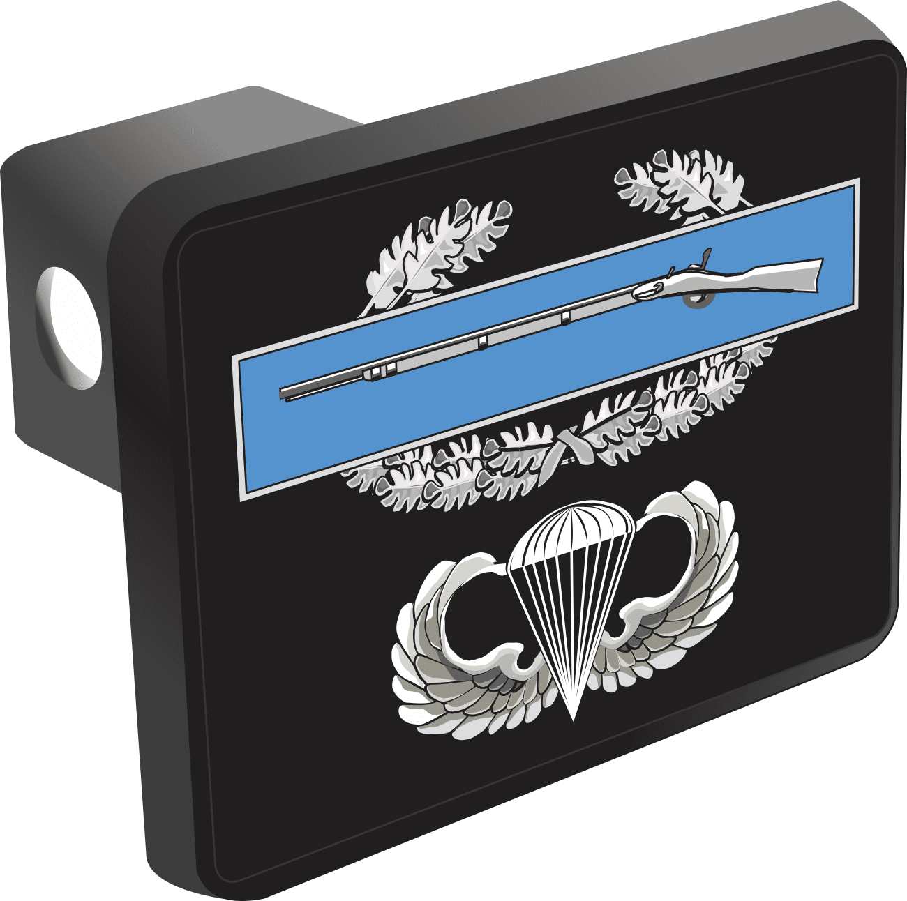 This U.S. Army Combat Infantry Badge First Award with Jump Wings Hitch Cover is proudly Made in the USA. Each Hitch Cover's face plate measures 4.7" x 3.4" and is applied on a black heavy duty injection molded plastic 2" hitch cover; link pin not included. The face plate of the hitch cover is sublimation printed to provide a beautiful glossy finish sure to catch the eye. This hitch cover would make a wonderful addition to your truck or other vehicle.A percentage of the sale of each ArmyDecals item is forwarded to the licensing departments of each respective branch of service in support of the MWR (Morale, Welfare, & Recreation) program. These payments are made by either ALL4U LLC or the wholesaler from where the item originated. Our team thanks you for your service and your support of these programs.