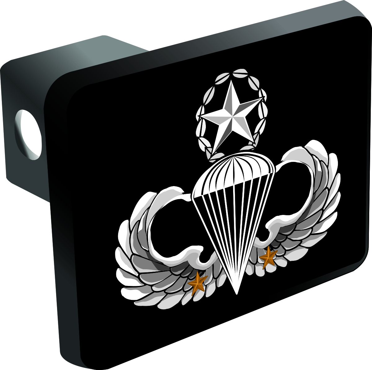 This U.S. Army Master 2 Combat Jump Wings Trailer Hitch Cover is proudly Made in the USA. Each Hitch Cover's face plate measures 4.7" x 3.4" and is applied on a black heavy duty injection molded plastic 2" hitch cover; link pin not included. The face plate of the hitch cover is sublimation printed to provide a beautiful glossy finish sure to catch the eye. This hitch cover would make a wonderful addition to your truck or other vehicle.A percentage of the sale of each ArmyDecals item is forwarded to the licensing departments of each respective branch of service in support of the MWR (Morale, Welfare, & Recreation) program. These payments are made by either ALL4U LLC or the wholesaler from where the item originated. Our team thanks you for your service and your support of these programs.