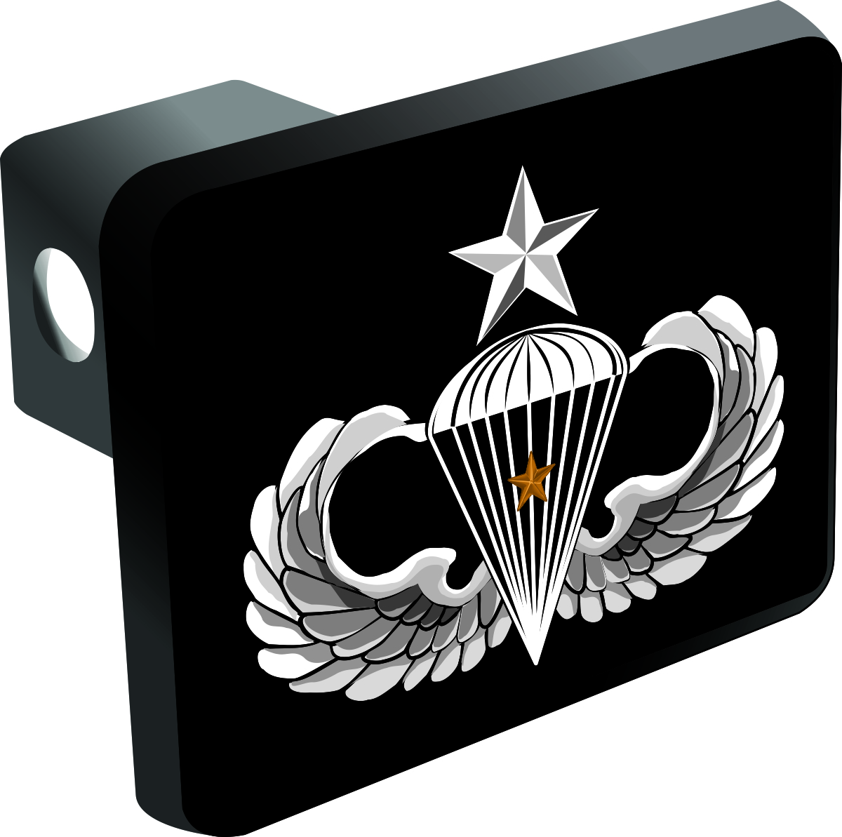 This U.S. Army Senior 1 Combat Jump Wings Trailer Hitch Cover is proudly Made in the USA. Each Hitch Cover's face plate measures 4.7" x 3.4" and is applied on a black heavy duty injection molded plastic 2" hitch cover; link pin not included. The face plate of the hitch cover is sublimation printed to provide a beautiful glossy finish sure to catch the eye. This hitch cover would make a wonderful addition to your truck or other vehicle.A percentage of the sale of each ArmyDecals item is forwarded to the licensing departments of each respective branch of service in support of the MWR (Morale, Welfare, & Recreation) program. These payments are made by either ALL4U LLC or the wholesaler from where the item originated. Our team thanks you for your service and your support of these programs.
