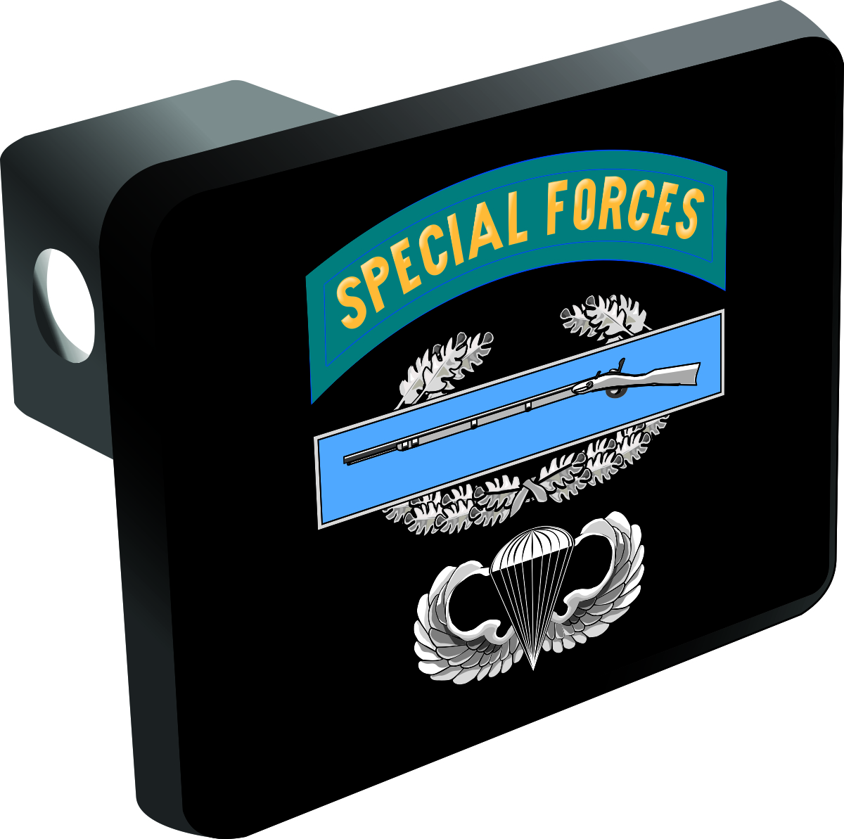 This U.S. Army Special Forces CIB Jump Wings Trailer Hitch Cover is proudly Made in the USA. Each Hitch Cover's face plate measures 4.7" x 3.4" and is applied on a black heavy duty injection molded plastic 2" hitch cover; link pin not included. The face plate of the hitch cover is sublimation printed to provide a beautiful glossy finish sure to catch the eye. This hitch cover would make a wonderful addition to your truck or other vehicle.A percentage of the sale of each ArmyDecals item is forwarded to the licensing departments of each respective branch of service in support of the MWR (Morale, Welfare, & Recreation) program. These payments are made by either ALL4U LLC or the wholesaler from where the item originated. Our team thanks you for your service and your support of these programs.