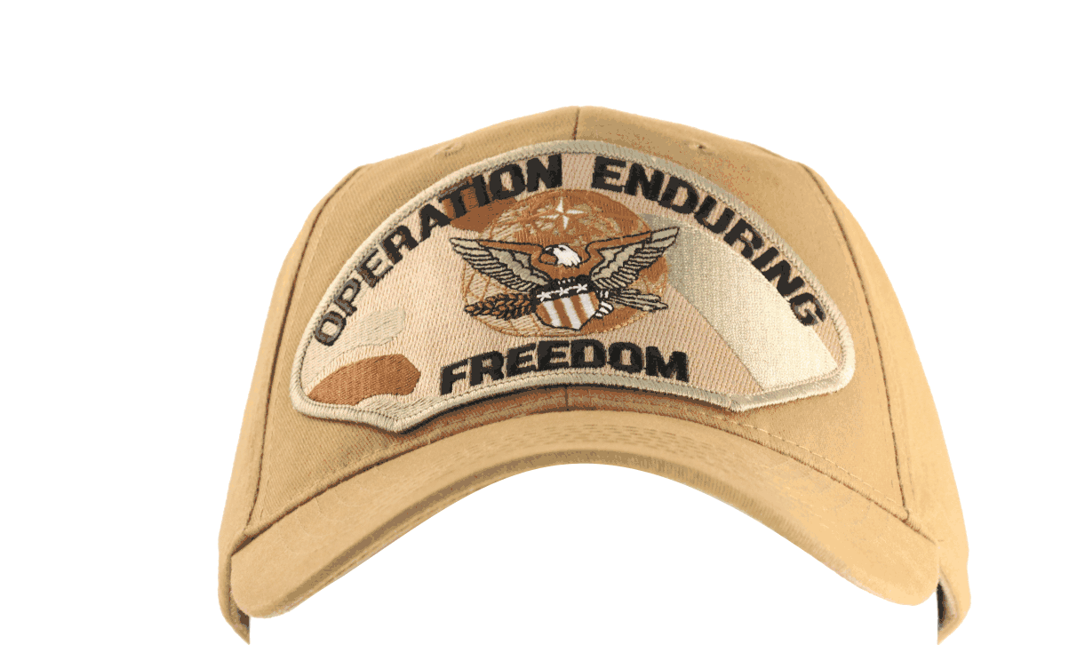 This Operation Enduring Freedom Desert Camo Ball Cap is six panel, emblematic, cotton twill, dark under the visor, full back (not mesh) and fully adjustable. All of our Military hats are fully guaranteed. These are the same ball caps found throughout the Military. This cap would make a wonderful addition to your collection or a great gift!