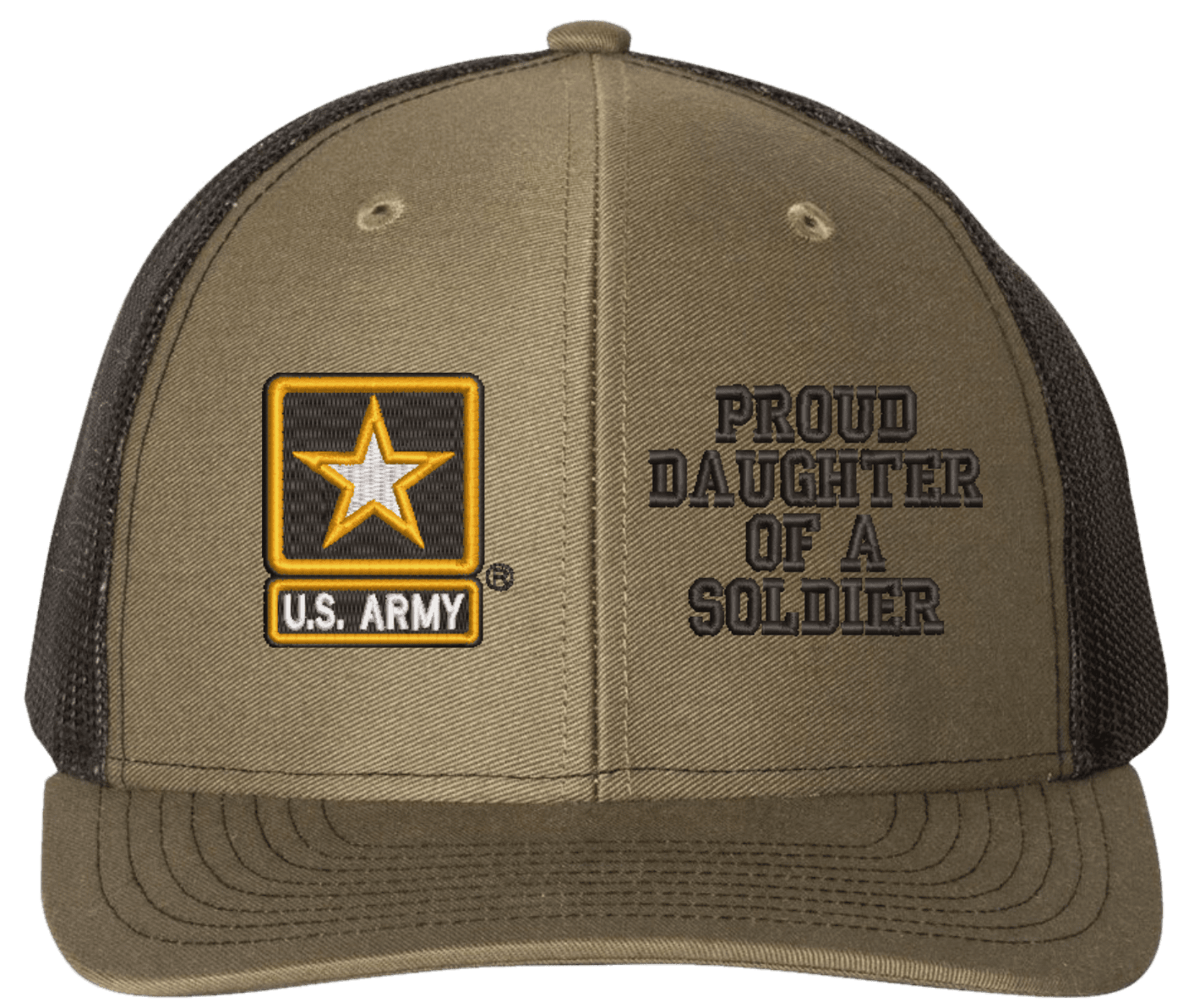 ArmyDecals is proud to offer this Proud Daughter of a Soldier U.S. Army Mesh Back Cap. The design of this U.S. Army Cap is crisp, clean, and sure to be loved by people of all ages! Select above from our many cap colors. This Proud Daughter of a Soldier U.S. Army Mesh Back Cap is crafted by our skilled embroidery technicians at our facilities in Scottsboro, AL. As with all ArmyDecals items, your satisfaction is guaranteed!